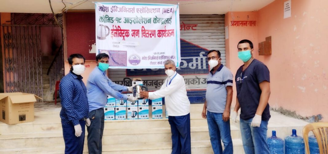 नवगठित मधेश इन्जिनियर्स एसोसिएसन (MEA) को कमिटीले जिल्लाको तीन वटा स्थानीय तहमा रहेको कोभिड(१९ आइसोलेसन केन्द्रलाई इलेक्ट्रोनिक जग वितरण गरेको छ ।