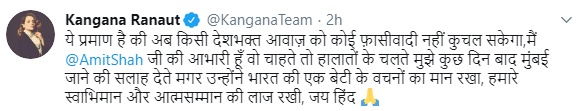 एजेन्सी ।। बलिउड अभिनेत्री कंगना रनौतलाई वाई श्रेणीको सुरक्षा प्रदान गरेको छ । यसमा अभिनेत्री कंगनाले केन्द्रीय गृहमन्त्री अमित शाहलाई धन्यवाद दिदै भारतकी छोरीको मान बढाउने काम गरेको भन्दै प्रसंशा गरेकी छिन् ।