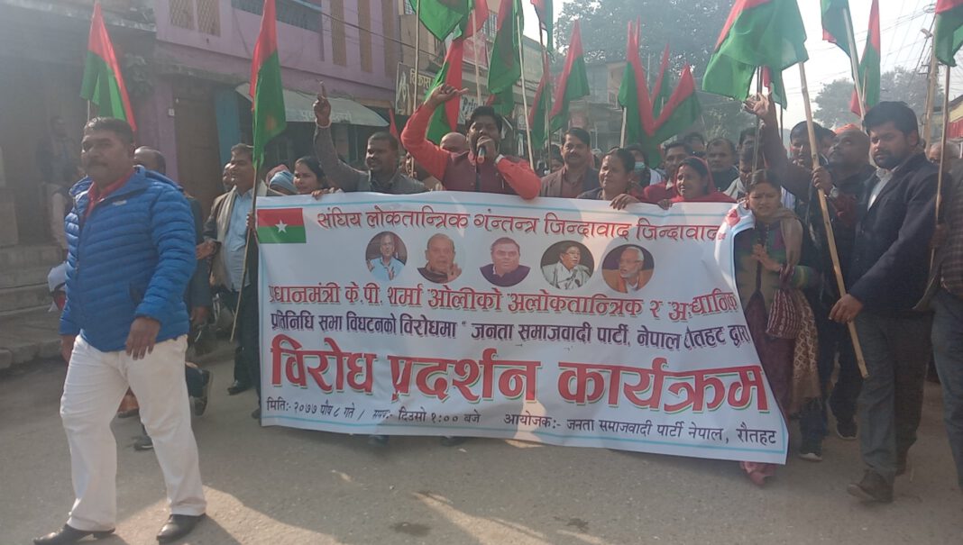 रौतहट ।। रौतहटमा जनता समाजवादी पार्टीले प्रदर्शन गरेको हो । संघीय संसद् विघटन गर्ने प्रधानमन्त्री ओलीको कदमविरुद्ध जनता समाजवादी पार्टी (जसपा) ले आज सदरमुकाम गौरमा विरोध प्रदर्शन गरिएको छ । केन्द्रीय कमिटिले देशको ७७ वटै जिल्लामा बुधबार विरोध प्रदर्शन गर्ने निर्णय अनुसार जसपा पर्सा कमिटिले आज जिल्लाको सदरमुकाम गौरमा विरोध प्रदर्शन गरेको हो ।