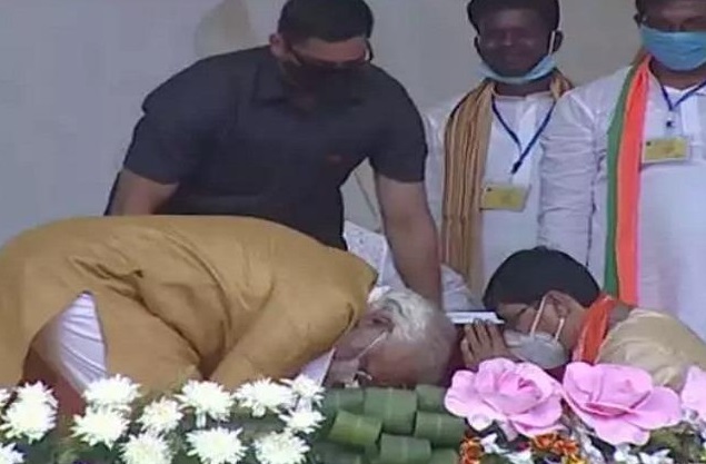 मञ्चमा भारतीय जनता पार्टीका एक कार्यकर्ता मोदीको गोडा छुन आएका थिए । मोदी आफैं कार्यकर्तातिर गए अनि झुकेर प्रणाम गर्दै उनकै गोडा छोए । यसअघि मोदीले भाषण गर्दै बंगालले सम्पूर्ण भारतलाई वन्दे मातरमको भावनामा बाँधेको र भाजपा सत्तामा आएमा बंगालको धर्तीकै छोरालाई मुख्यमन्त्री बनाउने बताए ।याे समाचार लाेकतन्त्रमा छापिएकाे छ ।