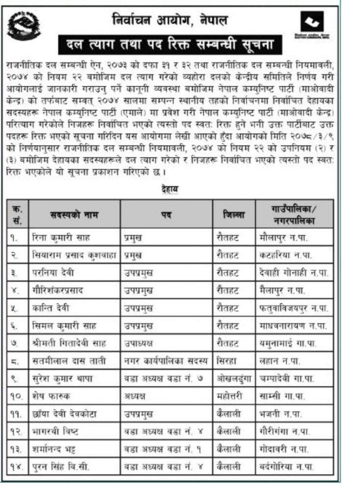 माओवादीबाट एमाले प्रवेश गरेका १४ जना जनप्रतिनिधि पदमुक्त