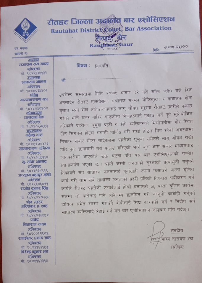 राहुल कुमार पाण्डेय ।। राैतहट ।। नेपाल प्रहरी रौतहटकै संलग्नतामा रिसिवि साधन पत्रकारलाई फसाईएको घटनामा दोसीलाई सिघ्र कारवाही गर्न रौतहट जिल्ला अदालत बार एशोसिएसनले मागँ गरेको छ । गत साउन ३२ गतेका दिन लागु औषध ओसार पसार कारोवारमा संलग्न भएको आरोपमा पक्राउ परेका अनलाइ रौतहट एक्सप्रेसका संचालक महमद मोजिवुल्ला र नावालक शेख गुलाब भन्ने शेख अतिउल्लाहलाई रौतहट प्रहरीले पक्राउ घटनामा सार्वजनिक भएको आडियो तथा सिसिटिभ फोटेजले नेपाल प्रहरीकै पुष्टी भएको हो । रौतहट जिल्ला अदालत बार एशोसिएसन गौरले आज एक प्रेश विज्ञप्त जारी गर्दै, पत्रकार फसाउने घटना प्रति गम्भीर ध्यानाकार्षण भएको भन्दै एशोसिएसन प्रहरी जस्तो जनतालाई पुर्वाग्राही रुपमा फसाउने जस्ता घृणित कार्य गरि आम सर्वसाधारण जनताको प्रहरीको प्रतिको विश्वास क्षयीकरण गर्ने कार्यले रौतहट प्रहरीको उचाईलाई होचो बनाएकोले यस्ता घृणित कार्यमा संलग्न जो कसैलाई पनि अविलम्व छानवीन गरि कानुनी कार्वाहरु गर्नुपर्ने दायित्व समेत स्मरण गराउदै दोषीलाई सिघ्र कारवाही गर्न र निर्दोष सर्वसाधारण व्यक्तिलाई रिहाई गर्न जोडदार मागँ गर्दछ एशोसीएसनका सचिव भाग्य नारायण झाद्वारा जारी विज्ञप्तमा उल्लेख रहेको छ । पत्रकार मोजिबुल्लाहलाई होटेल ग्रीन सिग्नलमा खाजा खान बोलाएर होटेल अगाडी पार्किंग गरि राखिएको बी आर ३० १८८७ नम्बरको ग्लेम्बर मोटर साइकलको हेड लाइट भएको ठाउको मुनि जिल्ला प्रहरी कार्यालयका घुमुवा प्रहरीको टोलीले लागु औषध नाईट्रो भेट ७ पता १०५ वटा कालो प्लास्टिकको झोलामा हाल्न लगाई खाजा खाएर होटेलबाट निसेकेका संचारकर्मी मोजिबुल्ल्लाह लाइ होटेल देखि पर बसेका घुमुवा प्रहरीले पक्राउ गरेको थियो ।
