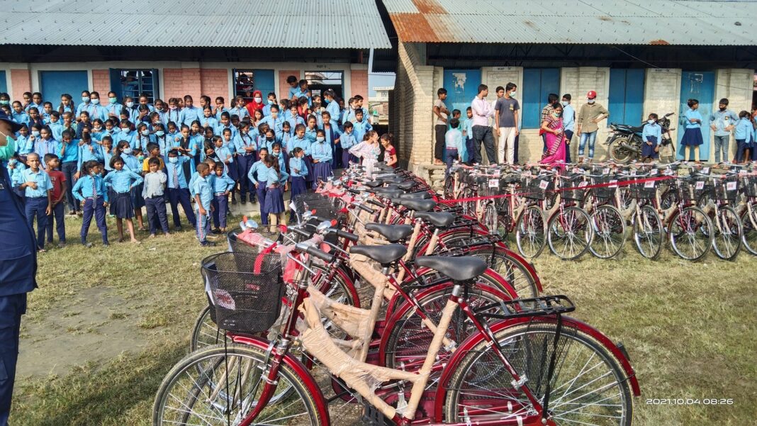 प्रदेश २ सरकारको मुख्यमन्त्री ’बेटी पढाऊ, बेटी बचाउ झअभियान अन्तर्गत प्रदेश न. २ को मुख्यमन्त्री कार्यालय जनकपुरधामबाट शैक्षिक सत्र २०७७ मा कक्षा ८ उत्तीर्ण गरी कक्षा ९ मा अध्ययनरत रहेका ४६ जना छात्राहरुलाई साइकल वितरण गरिएको हो