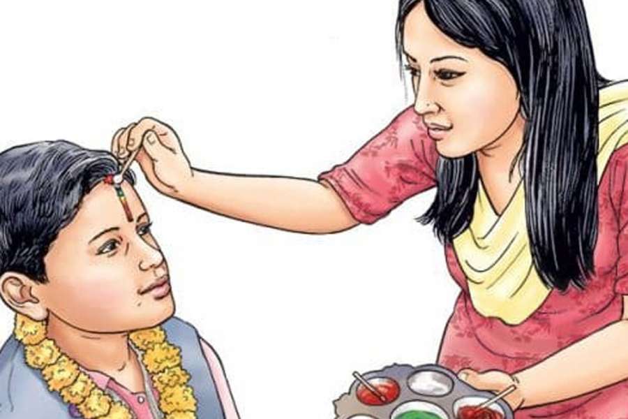 काठमाडाैं ।। तिहारको पाँचौँ दिन आज भाइटीका, दिदीबहिनीले आफ्ना दाजुभाइलाई श्रद्धा, आस्था र निष्ठाका साथ दीर्घायु, आरोग्य र ऐश्वर्य प्राप्तिको कामना गर्दै परम्पराअनुसार पञ्चरङ्गी वा सप्तरङ्गी टीका लगाएर मनाइँदैछ । प्रत्येक वर्ष कार्तिक शुक्ल द्वितीयाका दिन मनाइने नेपालीको दोस्रो ठूलो चाड तिहारको मुख्य दिन आज दाजुभाइले दिदीबहिनीबाट टीका ग्रहण गर्दैछन् । आजको दिनलाई यमद्वितीया पनि भनिन्छ । दिदीबहिनीले दाजुभाइलाई टीका लगाएपछि दाजुभाइले पनि दिदीबहिनीलाई टीका लगाउने गरिन्छ । दिदीबहिनीलाई पूजा गर्नाले अखण्ड सौभाग्य र ऐश्वर्य प्राप्त हुने शास्त्रीय मान्यता रहेको नेपाल पञ्चाङ्ग निर्णायक समितिका सदस्य सचिव सूर्य ढुङ्गेलले बताउनुभयो । भाइटीकाको टीका आज दिनभर लगाउन कुनै बाधा नभए पनि साइत खोज्नेका लागि बिहान ११ बजेर २ मिनेटमा उत्तम समय रहेको उहाँको भनाइ छ । समितिका सदस्य सचिव ढुङ्गेलका अनुसार यस वर्ष भाइटीका लगाइदिने पूर्व र लगाइमाग्ने पश्चिम फर्कनुपर्ने छ । यसो गरेमा वृश्चिक राशिमा रहेका उत्तरका चन्द्रमा दाहिने पर्नेछन् । शुभ कर्ममा चन्द्रमालाई अघि वा दाँहिने पार्नु पर्ने शास्त्रीय मान्यता रहेको छ । राज्य सञ्चालकले भने साइतमै टीका लगाउनु पर्ने समितिले जनाएको छ । आज लक्ष्मी पूजाका दिन स्थापना गरिएको दियो, कलश र गणेशको पूजा गरी मूल थालीमा लेखिएको अष्टदलमा मार्कण्डेय, अश्वत्थामा, बलि, व्यास, हनुमान, विभीषण, कृपाचार्य र पर्शुराम गरी अष्ट चिरञ्जीवी, चित्रगुप्त, यमराज, यमुना र धर्मराज, गणपत्यादि वनस्पत्यन्त देवताकोसमेत पूजा आराधना गरी दिदीबहिनीले दाजुभाईलाई तेलको धाराले छेकेर परम्पराअनुसार सप्तरङ्गी वा पञ्चरङ्गी टीका, मखमली, सयपत्री वा गोदावरी लगायतका फूलका माला लगाइदिने गरिन्छ । टीका लगाइदिएपछि दिदीबहिनीले दाजुभाइलाई ओखर, कटुस, मर मसला एवं सेलरोटीलगायतका खानेकुरा दिने र दाजुभाइले पनि दिदीबहिनीलाई गच्छेअनुसार सौभाग्यका प्रतीक कपडा र दक्षिणा दिई सम्मान प्रकट गर्ने धार्मिक एवं सामाजिक परम्परा छ ।