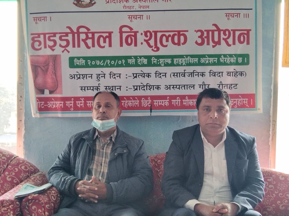 कार्यक्रममा नेपाल पत्रकार महासंघ प्रदेश सदस्य शैलेन्द्र झा , जिल्ला सभापति प्रेमचन्द्र झा , डाक्टर फिरोज अन्जुम समेतले प्रादेशिक अस्पताल गौरमा भै रहेको निशुल्क हाइड्रो शिलको अप्रेशन शिविर मा सहभागी हुन् पिडितहरुलाई आग्रह गरेका हुन् ।