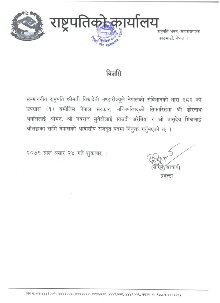 ‘राष्ट्रपति विद्यादेवी भण्डारीले नेपालको संविधानको धारा २८२ को उपधारा ९१० बमोजिम नेपाल सरकार, मन्त्रिपरिषद्को सिफारिसमा डोरनाथ अर्याललाई ओमन, नवराज सुवेदीलाई साउदी अरेबिया र वासुदेव मिश्रलाई श्रीलंकाका लागि नेपालको आवासीय राजदूत पदमा नियुक्त गर्नुभएको छ,’ प्रवक्ता आचार्यले जारी गरेको विज्ञप्तिमा उल्लेख गरेका छन् ।