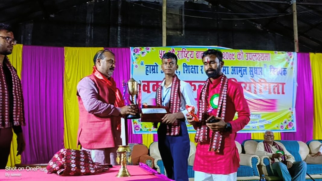 उक्त प्रतियोगितामा प्रथम दोस्रो र तेस्रो हुनेलाइ नगर प्रमुखसाहले पुरस्कार र शिल्ड प्रदान गर्नु भयो ।नगर प्रमुख साहले प्रतियोगिताले बाल बालिकाको बोल्ने शक्ति तथा क्षमतामा ठुलो सहयोग पुग्ने कुरामा विश्वास प्रकट गर्नु भयो ।सो प्रतियोगितामा अभिभावक र विधार्थीको सहभागिता रहेको थियो ।एसएसआर मिडिया नेपाल प्रा.लि. ले ५८ औं राष्ट्रिय बाल दिवस २०७९ को उपलक्ष्यमा कार्यक्रम आयोजना गरिएका थिए । कार्यक्रम रामअधार यादवले संचालन गरेका थिए ।