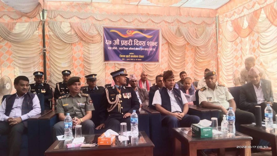 राैतहट ।। रौतहटमा विभिन्न कार्यक्रमको आयोजना गरी ६७ औ प्रहरी दिवस मनाइएको छ ! २०१२ सालमा स्थापना भएको प्रहरी संगठनको स्थापना दिवसको अवसर परेर विभिन्न कार्यक्रम आयोजना गरी जिल्ला प्रहरी कार्यालय रौतहट प्रहरी दिवस मनाएको हो ! जिल्ला प्रहरी कार्यालय गौरमा आयोजना गरिएको कार्यक्रममा अमर प्रहरीका परिवारहरुलाई दोसल्ला ओढाएर सम्मान गरिएको छ ! सम्मान गरिएको अमर प्रहरी परिवरहरुमा सुनीता देवी , दुखिया देवी यादव , साहिना खातून , शेख इश्लाम , राकेश साह , रति देवी साह , निर्मला झा रहेका छन ! त्यस्तै शान्ति सुरक्षामा भूमिका निर्वाह गरेका समाजसेवी बृज किशोर यादव , ग्रामीण विकास केन्द्र नेपाल का अध्यक्ष पारस हुसैन , आधारभूत विद्यालय बाल मंदिरका प्राध्यानध्यापक राम नरेश यादव , गढ़ीमाई नगर पालिका , बृंदाबन नगरपालिकाका शेख असलम लाइ कदर पत्र बाट सम्मानित गरिएको छ ! प्रहरी दिवसको अवसरमा आयोजना गरिएको बैडमिंटन प्रतियोगिता , ४०० मीटर र १०० मीटर दौड़ प्रतियोगिता , घईटो फुटाउने प्रतियोगिताका सफल प्रतियोगीहरुलाई पुरस्कृत गरिएको जिल्ला प्रहरी कार्यालयले जनाएको छ ! प्रमुख जिल्ला अधिकारी कृष्ण बहादुर शाहीको प्रमुख आतिथ्यमा संपन्न भएको सो कार्यक्रममा प्रहरी उपरीक्षक वीर बहादुर बुढामगरले प्रहरी महानिरीक्षक धीरज प्रताप सिंहले दिएको शुभकामना सन्देश बाचन गरेका थिए ! कार्यक्रममा सुरक्षा निकायका प्रमुख , संघ सस्थाका प्रतिनिधि , पूर्व प्रहरी कर्मचारी , संचारकर्मीहरुको सहभागिता रहेको थियो ! कार्यक्रमको संचालक प्रहरी निरीक्षक दिनेश कुंवरले गरेका थिए !