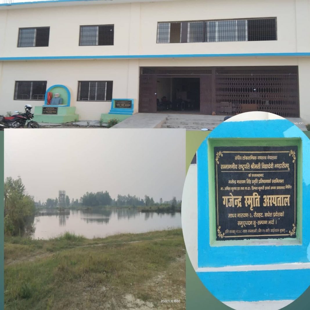 राैतहट ।। राष्ट्रपति विधा देवी भण्डारीले उदघाटन गर्नु भएका गजेन्द्र स्मृति अस्पताल आफैमा विरामी अवस्थामा रहेका छन । रौतहट निर्वाचन क्षेत्र नम्बर १ बाट राजपा नेपालबाट प्रतिनिधि सभामा निर्वाचित भएका पूर्व मंत्री एवं सांसद अनिल कुमार झाले गजेन्द्र नारायण सिंह स्मृति प्रतिष्ठान तथा डिम्पल अनिल फाउनडेसनको नाउमा जग्गा खरीद गारी निर्माण गरिएको गजेन्द्र स्मृति अस्पताल उदघाटन भए पनि अहिले सम्म सञ्चालन हुन सकेका छैन । भारत सरकार , नेपाल सरकार र संघीय सरकारको लगानी समेत रहेको उक्त अस्पताल उदघाटन भए पछि सञ्चालनमा आऊँन सकेका छैन ।