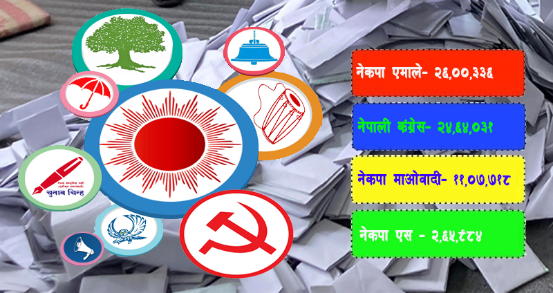 काठमाडौं ।। निर्वाचन आयोगले प्रतिनिधिसभाको समानुपातिकतर्फ ९६ लाख ४७ हजार ४१० मत गणना सकिएको जनाएको छ । सोमबार बिहान ११ बजेको विवरणअनुसार नेकपा एमालेले २६ लाख ३३६ मत पाएको पहिलो स्थान कायमै राखेको छ भने कांग्रेसले २४ लाख ६४ हजार ३१ मत पाएर एमालेलाई पछ्याइरहेको छ ।