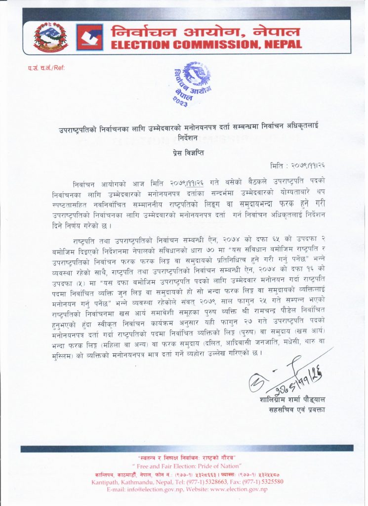 आयोगको आज बसेको बैठकले उपराष्ट्रपति पदको निर्वाचनका लागि उमेदवारको मनोनयनपत्र दर्ता सम्बन्धमा निर्वाचन अधिकृतलाई निर्देशन दिने निर्णय गरेको सहसचिव एवं प्रवक्ता शालिग्राम शर्मा पौड्यालले जानकारी दिए । यही फागुन २७ गते उपराष्ट्रपति पदको मनोनयनपत्र दर्ता हुँदै छ । राष्ट्रपतिको पदमा निर्वाचित व्यक्तिको लिङ्ग (पुरुष) वा समुदाय (खस आर्य) भन्दा फरक लिङ्ग (महिला वा अन्य) वा फरक समुदाय (दलित, आदिवासी जनजाति, मधेसी, थारु वा मुस्लिम) को व्यक्तिको मनोनयनपत्र मात्र दर्ता गर्ने संवैधानिक प्रावधान छ ।