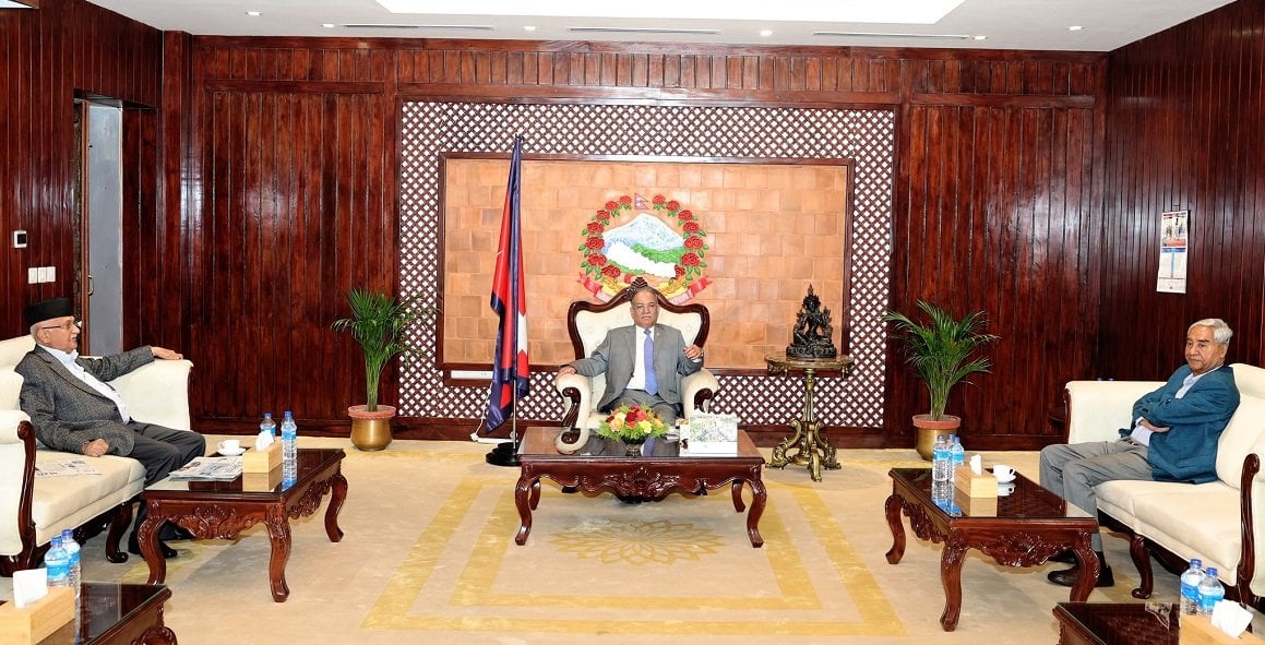 प्रधानमन्त्रीको सरकारी निवास बालुवाटारमा आइतबार प्रधानमन्त्री तथा माओवादी केन्द्रका अध्यक्ष पुष्पकमल दाहाल (प्रचण्ड), नेपाली काँग्रेसका सभापति शेरबहादुर देउवा र एमाले अध्यक्ष केपी ओलीबीच छलफल भएको छ। तीन नेताबीच बजेट र नीति तथा कार्यक्रमसहित संसदीय सुनुवाइ समिति गठनबारे छलफल भएको प्रधानमन्त्रीको सचिवालयले जनाएको छ ।