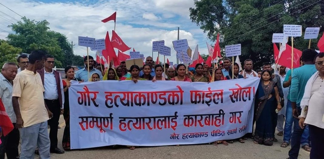 राैतहट ।। गौर हत्याकाण्डका दोषीलाई कारबाहीको माग गर्दै आज रौतहट जिल्लाको सदरमुकाम गौरमा प्रदर्शन भएको छ । आम जनता पार्टीका जिल्ला अध्यक्ष धर्मेन्द्र पटेलको नेतृत्वमा निस्किएको जुलुशमा हज़ारौंका संख्यामा रहेका प्रदर्शनकारीहरूले हत्याकाण्डका नाइके उपेन्द्र यादवको गिरफ्तारीको माग गर्दै गौर हत्याकाण्ड पीडित संघर्ष समितिका संयोजक एवं सहिद परिवार रुपसागर देवीले प्रमुख जिल्ला अधिकारीको अनुपस्थितिमा प्रशासकीय अधिकृत निरज श्रीवास्तवलाई ज्ञापन पत्र बुझाएका छन् ।