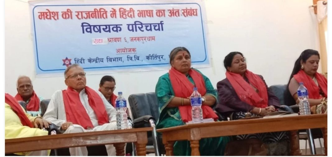 ‘मधेसको राजनीतिमा हिन्दी भाषाको अन्तरसम्बन्ध’ विषयक परिचर्चा कार्यक्रममा सरोकारवालाले मधेसमा धेरै पहिलेदेखि नै बोलिने हिन्दी भाषा अधिकांशको सम्पर्क भाषाको रूपमा रहेकाले सरकारले हिन्दीलाई कामकाजको भाषाको मान्यता दिनुपर्ने बताए ।