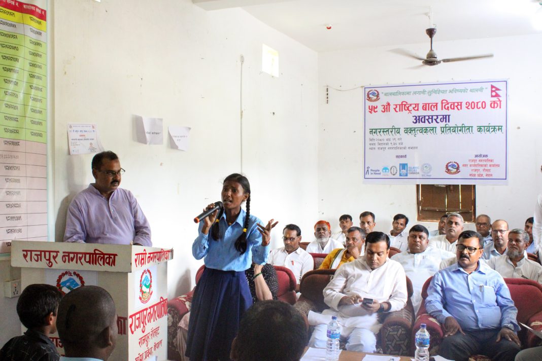 राजपुर नगरपालिकाले, आसमान नेपाल र क्इम्ऋऋ पर्साको सहकार्यमा नगरस्तरीय वक्तित्वकला प्रतियोगिता आयोेजना गरी ५९ औँ राष्ट्रिय बाल दिवस २०८० राजपुर नगरपालिकामा मनाएको थियो । जुन प्रतियोगितामा नगरपालिकामा रहेको सबै माध्यमिक विद्यालयहरुकोहरुको उपस्थिति रहेको थियो । यस प्रतियोगतामा जम्मा १४ जना छात्र र छात्राहरुको सहभागीता रहेको थियो । पालिकाको मेयर श्री डा. मो. राजिक आलम ज्यूको अध्यक्षतामा मनाएको ५९ औँ बाल दिवस कार्यक्रममा आसमान नेपाल, क्इम्ऋऋ पर्सा, आर.डि.सी.नेपाल, नगरपालिकाको जनप्रतिनिधि, शिक्षा प्रेमी, बुद्धिजिवी र कर्मचारीहरुको सहभागीता रहेको थियो ।