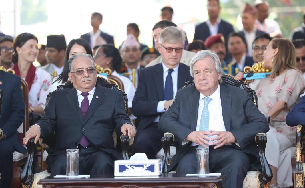 विराटनगर ।। संयुक्त राष्ट्रसंघका महासचिव एन्टोनियो गुटरेस गौतमबुद्धको जन्मभूमि लुम्बिनीबाट विश्व शान्तिका लागि आह्वान गरेका छन् । नेपालको चार दिने भ्रमणमा रहेका हासचिव गुटरेसले गौतमबुद्धको जन्मभूमि लुम्बिनीको मायादेवी मन्दिरबाट विश्वलाई नै शान्तिको सन्देश दिन पाएकोमा आफूलाई खुसी लागेको भन्दै गुटेरेसले युद्धरत मुलुकलाई शान्तिको बाटोमा लाग्न आग्रह गरेका हुन् । उनले हाल संसारभर देखिएको द्वन्द्वको अन्त्यको लागि लुम्बिनीबाट आह्वान समेत गरे । उनले भने, ‘संसारभर भइरहेका द्वन्द्व अन्त्यका लागि लुम्बिनीबाट आह्वान गर्छु ।’ इजरायल, प्यालेस्टाइन, सुडानलगायत देशमा जारी द्वन्द्व अन्त्य गर्न आह्वान गर्दै उनले बुद्ध जन्मस्थल लुम्बिनी आउन पाउँदा खुसी व्यक्त गरेका छन् । गुटेरेसलाई स्वागत गर्न लुम्बिनी पुगेका प्रधानमन्त्री पुष्पकमल दाहाल प्रचण्डले लुम्बिनी बुद्धको जन्मस्थल, बौद्ध धर्मावलम्बीको पवित्र तीर्थस्थल मात्रै नभएर शान्ति र सद्भावको केन्द्र समेत रहेको बताए ।