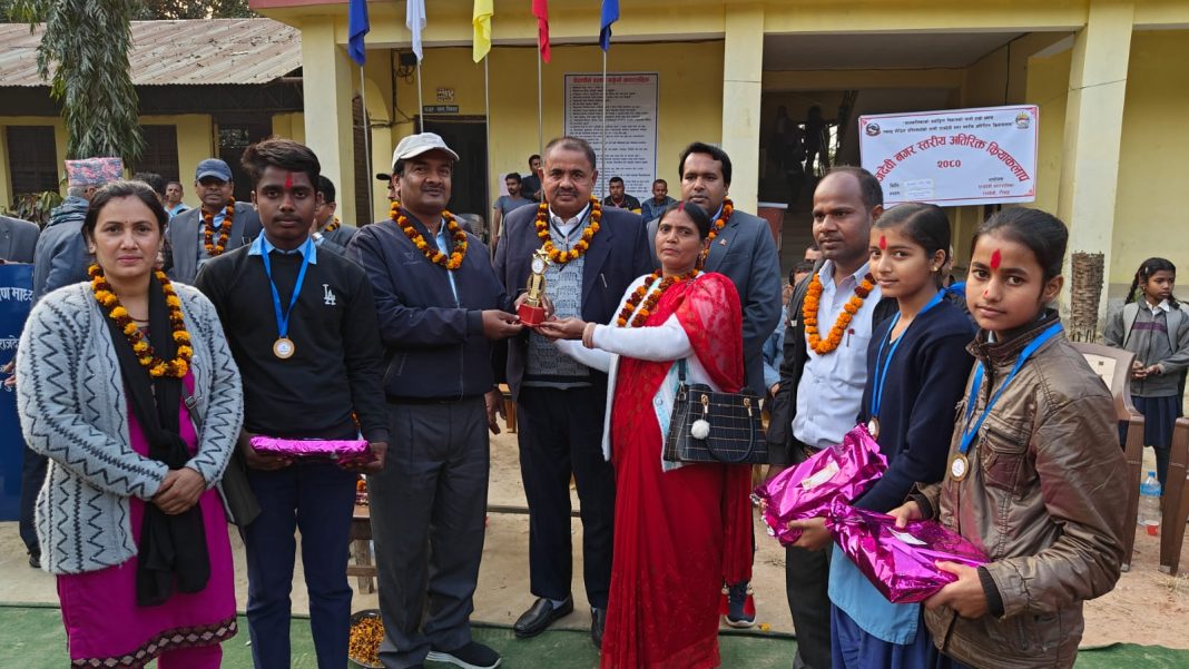 विजेता विद्यार्थी तथा विद्यालयलाई राजदेवी नगरपालिकाकाे नगरप्रमुख भिखारी प्रसाद यादव, उपप्रमुख राज कुमारी देवी साह तथा प्रमुख प्रशासकीय अधिकृत प्रलव कायस्थले पुरस्कार तथा ट्रफी वितरण गर्नु भयाे । मा वि हजमिनियाकाे सहायक प्रधानाध्यापक नरेश यादव तथा मा वि ब्रह्मुरीकाे सूचना अधिकारी राम विश्वास मुखियाले संयुक्तरूपमा सञ्चालन गर्नुभएको साे कार्यक्रममा नगर प्रमुख यादव , नगर उपप्रमुख साह र प्रमुख प्रसाशकीय अधिकृत कायस्थले मन्तव्य राख्नु भयाे ।