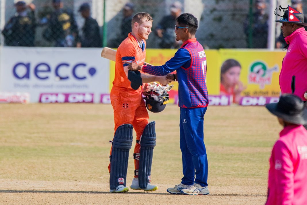 काठमाडौँ ।। नेपाल आइसिसी क्रिकेट विश्वकप लिग–२ अन्तर्गत त्रिदेशीय शृङ्खलाको अन्तिम खेलमा नेदरल्यान्ड्ससँग आठ विकेटले पराजित भयो। आइतबार कीर्तिपुरस्थित त्रिवि क्रिकेट मैदानमा नेपालले नेदरल्याण्ड्सलाई १ सय ७३ रनको लक्ष्य दिएको थियो। नेपालले दिएको चुनौती सामना गर्न नेदरल्याण्ड्सले पुरै ओभर पनि खेल्नु परेन। उसले ३७.५ ओभरमा दुई विकेट गुमाएरै लक्ष्य पुरा गर्यो । नेदरल्यान्ड्सका विक्रमजित सिंहले अविजित ५८ रन बनाएका थिए। एन्जेलब्रेटले ७५ बलमा तीन चौकासहित ४६ रन जोडेका थिए। आइतबारको नतिजासँगै घरेलु मैदानमा शृङ्खलाका चार खेलमध्ये नेपालले तीन खेल हारिसकेको छ । टस हारेर ब्याटिङ पाएको नेपालले ४९.३ ओभरमा सबै विकेट गुमाएर १७२ रन बनाएको थियो। नेपालबाट ओपनर कुशल भुर्तेलले ६६ रन बनाएका थिए । करण केसीले २६ , रोहित पौडेल १६ , आरिफ शेखले २२ र आसिफ शेखले १७ रन बनाएका थिए। अन्य खेलाडीले दोहोरो अंकको रन पनि बनाउन सकेनन् ।