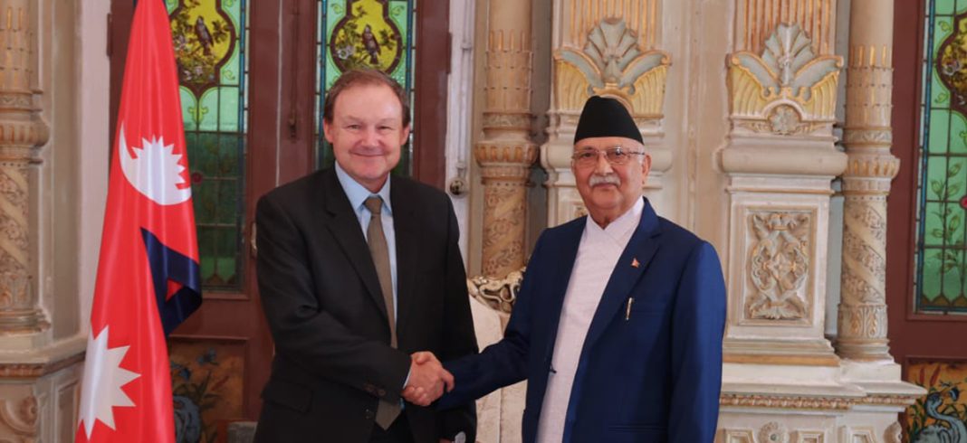 काठमाडौं ।। प्रधानमन्त्री केपी शर्मा ओलीसँग नेपालका लागि संयुक्त अधिराज्य बेलायतका राजदूत रोब फेनले मंगलवार शिष्टाचार भेट गरेका छन् । प्रधानमन्त्री तथा मन्त्रिपरिषद्को कार्यालयमा भएको भेटमा दुई देशबीचको सदियौँदेखिको आपसी सम्बन्ध र हितका विषयमा छलफल भएको छ ।