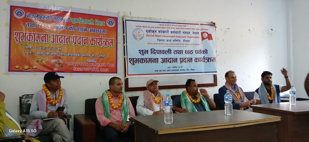रौतहट ।। रौतहट क्षेत्र नं. २ ख का विधायक कनिस पटेलले, तनै तहको सरकारले कर्मचारीहरुलाई विभेद गरेको बताउनु भएको छ । एकीकृत सरकारी कर्मचारी संगठन नेपाल तथा एकीकृत स्वास्थ्यकर्मी संगठन नेपालले शुभ दिपावली एवम् छठ पर्वको शुभ अवसरमा आयोजीत शुभकामना अदानप्रदान कार्यक्रमको प्रमुख आतिथ्यबाट बोल्दै विधायक पटेलले, संघको कर्मचारीलाई २४ क्यारेट प्रदेशकोलाई २२ क्यारेट र स्थानीयलाई १८ क्यारेटमा विभेदपुर्ण वर्गीकरण गर्नुको कारण कर्मचारीहरु विच्चलीमा परेको बताए । सवै तहको कर्मचारीहरुलाई २४ क्यारेट अर्थात एक सम्मान गर्नु पर्ने विधायक पटेलले भन्दै, हामी र हाम्रा पार्टी सदैव कर्मचारीहरुको मागँ प्रति प्रतिवद्ध रहेको बताए ।