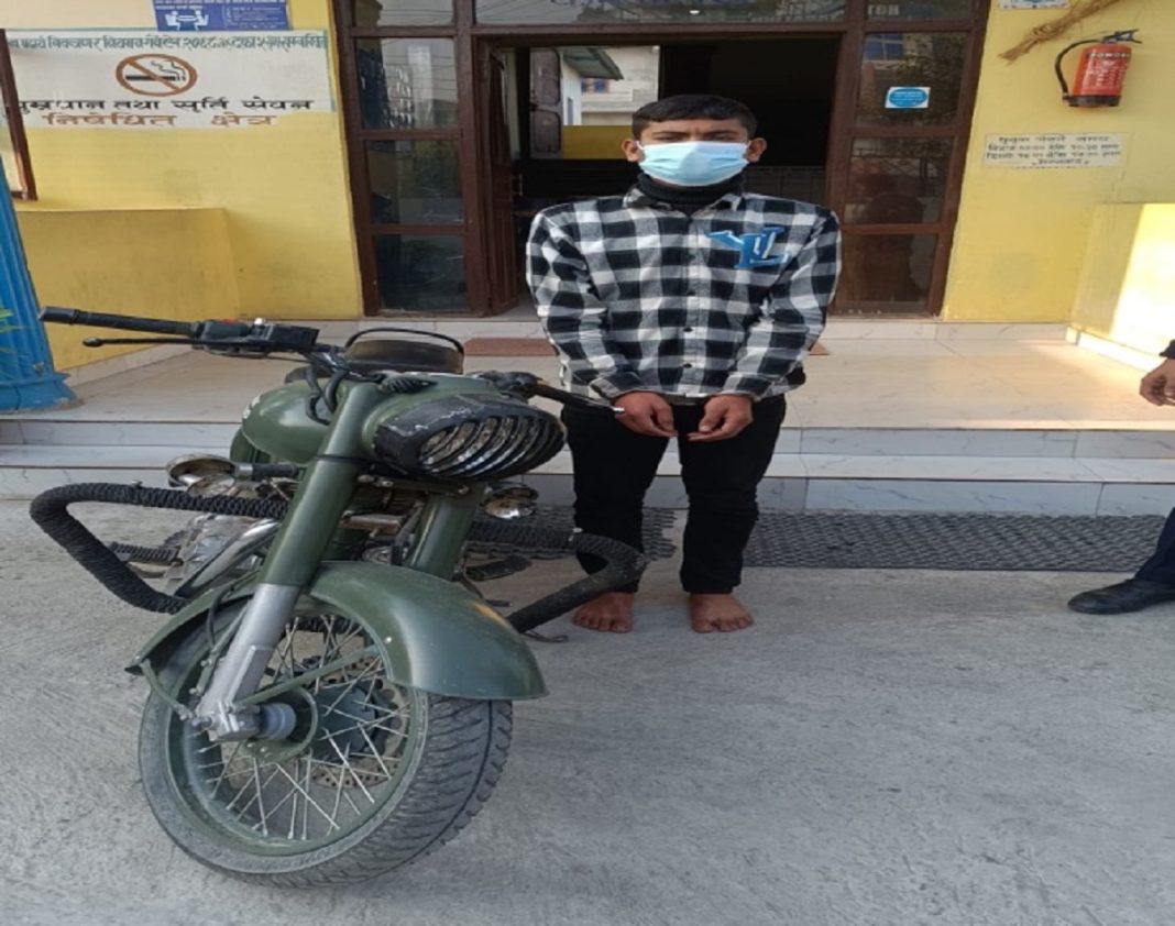 रौतहट ।। रौतहट स्थित चोरीको मोटरसाईकलसहित एकजनालाई प्रहरीले पक्राउ गरेको छ। पक्राउ पर्नेमा चन्द्रपुर नगरपालिका १० का १९ वर्षीय आयुष चौधरी रहेको जिल्ला प्रहरी प्रवक्ता डीएसपी दीपक कुमार रायले बताएका छन्।