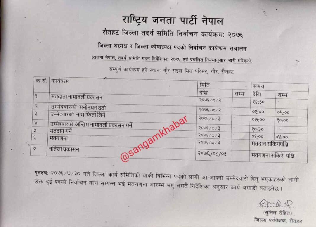 राैतहट ।। राष्ट्रिय जनता पार्टी नेपालको जिल्ला अधिवेशन हुनु भन्दा पूर्व रौतहटमा पार्टी भित्रै चरम विबाद चूलिएका छन ! मङ्सिर ३ गते जिल्ला अधिवेशन गर्ने गरी केन्द्रीय कार्य समितिले सर्कुलेशन जारी गरे पनि जिल्लामा पार्टीका नेताहरु विच आरोप प्रत्यारोप हुने कार्य शुरू भइसकेको छ !
