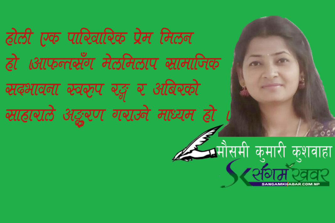 मौसमी कुमारी कुशवाहा ।। होली रङ्ग र गुुलालले मनाइने एक पर्व हो । होलीको दिन हरेक मानिस रङ्ग र गुुलालमा सराबोर भई सतरङ्गी भएको हुुन्छ । विशेष रुपले तराईमा र मित्र राष्ट्र भारतमा भव्य रुपमा यो पर्व मनाईन्छ । होली फागुुनको वसन्त पुुर्णीमाका रातमा होलिका दहन गरि भोलिपल्ट खेल्ने गरिन्छ । सानाले आफ्नो अग्रजलाई अबिरले ढोग गरेर आशिष लिन्छन् भने बच्चाहरु र युुवायुवतीहरु रङ्ग गुुलाल एक अर्कामाथि खन्याएर होली मनाउने गर्छन् । वर्षौको रिस द्वेषलाई भुुलेर नयाँ सम्बन्ध सुुरु गर्ने एक सशक्त माध्यम होली हो । हिन्दुुहरुको प्रसिद्ध चाडपर्वको रुपमा रहेको होलीको आफ्नो छुुटै आस्था र अस्तित्व रहेको हुुन्छ । अरु पर्वको तुुलनामा होलीलाई ठीक उल्टो तरीकाले मनाईन्छ । तराईका जति पर्वहरु छन्, सबमा भोकै व्रत बस्नुु, पुुजापाठ, नियम पालन, भगवान्को स्तुुति गर्नु जस्ता कार्य गरेपनि होली त्यसको उल्टो दिनभरी विभिन्न परिकार बनाएर खानुु, ठुुलो सानोमा भेद नगरी प्रेमको भावनाले जिस्कने रमाइलो गर्ने विभिन्न लोक सङ्गीतको आधार बनाई कटाक्ष व्यङ्ग्य गर्ने गरिन्छ । हाम्रो हिन्दुु संस्कृतिमा हरेक चाडपर्व सबै पौराणिक घटनासँग, अध्यात्मसँग जोडिएको हुुन्छ । होली पनि पौराणिक घटना मै अधारित रहेको छ । सत्ययुुगमा हिरण्यकश्यप नामको एउटा ठूलो दैत्य थियो । उ आफैलाई भगवान ठान्ने भएकोले उसको आफ्नै छोरा प्रहलाद विष्णुको ठुलो भक्त भई मन्त्र जप गर्न थाले । यस घटनाले आफ्नै छोरालाई अनेकौ शारीरिक यातना दियो । अन्त्यमा व्रम्हासँग अग्निको वरदान पाएकी आफ्नै बहिनी होलिकाको काखमा बसाएर आगो लगाएर मृत्युुदण्ड दिने योजना बनाए । फलस्वरुप त्यही आगोमा होलिका जलेर भष्म भइन् तर प्रहलादलाई आगोले कुुनै असर गरेन । यसर्थ यस घटनाबाट के सन्देश पाइन्छ कि असत्य माथि सत्यको विजय हुुन्छ । होली एक पारिवारिक प्रेम मिलन हो । आफन्तसँग मेलमिलाप सामाजिक सदभावना स्वरुप रङ्ग र अबिरको साहाराले अङ्कुुरण गराउने माध्यम हो । वर्षौदेखि आफन्तसँग भेट्न नपाएकाहरुका लागि भेटेर माया, प्रेम र सद्भावको एक बहाना पनि हो । होलीको दिन आफुुभन्दा अग्रजसँग आशिष लिने सानालाई माया र आशिष दिने गरिन्छ । परिवारमा छिमेकमा विभिन्न कारणले उत्पन्न भएको मनमुटाव, रिस, द्वन्दलाई होलीको माध्यमले भुुलाउने गरिन्छ । एक आपसमा बढेको नकारात्मक भावनामा रङ्गको सहाराले सद्भावको, प्रेमको रङ्ग चढाइन्छ । विभिन्न किसिमका मिठो मिष्ठान पकाएर आफन्त छिमेकमा बाड्ने, आपसी एकतालाई अझ बलियो बनाउने र भेटघाट गर्ने अंकमाल गर्ने र भाइचाराको भावना स्थापित गर्ने गरिन्छ । उमंग बिनाको फागुन र तरंग बिनाको होलीको कुनै अर्थ हुँुदैन । जबसम्म राधामोहनको प्रेम जस्तो मन कोमल, आत्
