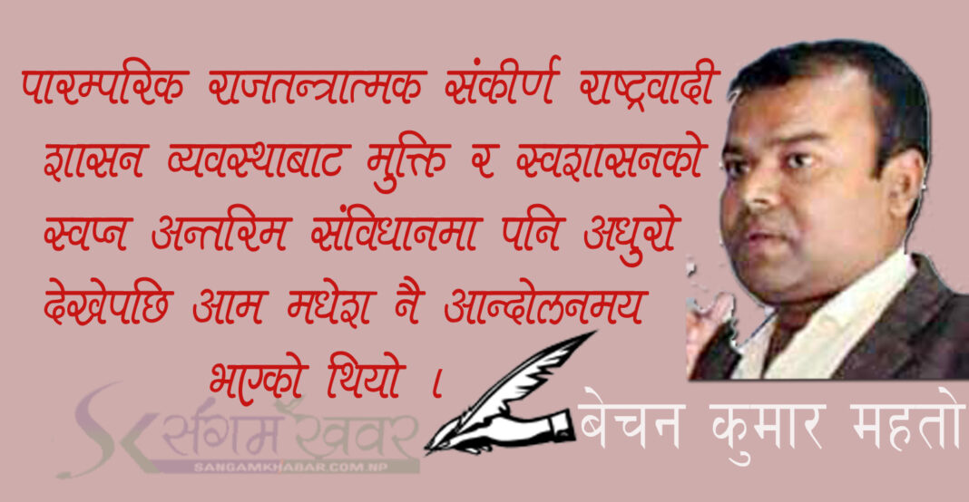 – बेचन कुमार महतो ।। २०६३ सालमा अन्तरिम संविधानमा संघीयता शब्द उल्लेख नभएको भनेर मधेश केन्द्रित दलले अन्तरिम संविधानको प्रति जलाएर आन्दोलन सुरूवात गरेका थिए । पारम्परिक राजतन्त्रात्मक संकीर्ण राष्ट्रवादी शासन व्यवस्थाबाट मुक्ति र स्वशासनको स्वप्न अन्तरिम संविधानमा पनि अधुरो देखेपछि आम मधेश नै आन्दोलनमय भएको थियो । एक मधेश स्वायत प्रदेश, पूर्ण समानुपातिक निर्वाचन प्रणाली, जनसंख्याको आधारमा निर्वाचन क्षेत्र, पहिचान र सामथ्र्यको आधारमा प्रदेशको घोषणा, सहिद परिवारलाई ५० लाख दिने घोषणा, प्रत्येक सहिद परिवारलाई रोजगारी दिने घोषणा, जनसंख्याको आधारमा आरक्षणको व्यवस्था, सेना र प्रहरीमा सामूहिक प्रवेश, पहिचानसहित शासनमा समानुपातिक सहभागिता, स्वशासन र आत्मनिर्णयको अधिकार जस्तो जनपक्षीय एजेन्डाको आकर्षणका कारण यसमा तराई मधेशका जनता व्यापक रूपमा सहभागी भए । हाल सम्म ११७ जनाको सहादत कै कारण यस आन्दोलनले तत्कालीन शीर्ष राजनीतिक दललाई संविधानमा नेपाललाई संघीय राज्य घोषणा गर्न बाध्य गरायो । यसबीच मधेश मात्र होइन, देशैभरि व्यापक विरोध, सरकारी दमनमा दर्जनौँको हताहती र सहादतबीच २०७२ मा दोस्रो संविधानसभाको माध्यमबाट नेपालको संविधान घोषणा गरियो । यसै संविधानबाट घोषित संघीय लोकतान्त्रिक गणतन्त्र नेपालमा सात प्रदेश र सात सय ५३ स्थानीय सरकार गठित छन् । माओवादी जनयुद्ध र मधेश आन्दोलनलगायत वर्गीय अधिकार र पहिचानका कतिपय मूल मुद्दा अहिले पनि उपेक्षित नै छन् । मधेशवादी दलले २०७२ मा जारी संविधानलाई समर्थन गरेनन् र संघीय अधिकार पूरा भएनन् भने वर्तमान राज्यको कुनै पनि गतिविधिमा सहभागी नहुने घोषणा गरेका थिए । तर, उनीहरूको दृढता धेरै दिन टिक्न सकेन । उनीहरूले अनेक निहुँमा केन्द्रीय, प्रादेशिक र स्थानीय निर्वाचनमा भाग लिए । कुनै वेला शीर्ष दललाई मधेश विरोधीका रूपमा चित्रित गरिरहेका यी दलले निर्वाचनमा भाग मात्र लिएनन्, काँग्रेसका शेरबहादुर देउवा होउन् वा माओवादीका प्रचण्ड वा तत्कालीन एमाले वा अहिलेको नेकपाका अध्यक्ष केपी ओली नेतृत्वका सबै सरकारमा समेत सामेल हुँदै आएका छन् । निहुँ भने अहिले पनि उही मधेश आन्दोलनकाल देखिकै संविधान संशोधनको ललिपप नै हो । जनतालाई एजेन्डामा भुलाउँदै यसैलाई भर्याङ बनाएर सत्ताभोग गरि राख्नु मधेश राजनीतिको गुरूमन्त्र बनेको छ । मधेशवादी दलको यही गुरूमन्त्रको आधारमा घट्दो धरातलीय गुरूत्वाकर्षणलाई निम्नानुुसार चित्रण गर्न सकिन्छ ः